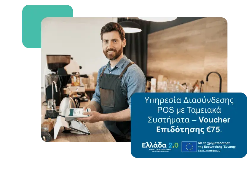 Μειώστε το κόστος της υπηρεσίας διασύνδεσης με τα ταμειακά συστήματα, το οποίο ανέρχεται σε 78€, για κάθε POS που διαθέτει η επιχείρησή σας αξιοποιώντας το voucher €75, Κατηγορία 7 του προγράμματος Ελλάδα 2.0.
